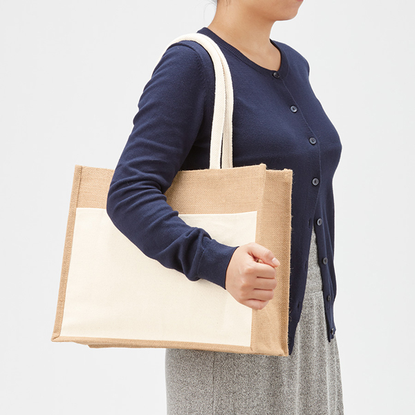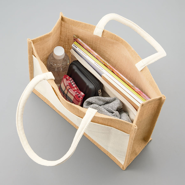 通気性・耐久性も抜群で大人気な麻素材のジュートバッグにキャンバス素材のポケットを組み合わせたトートバッグ。